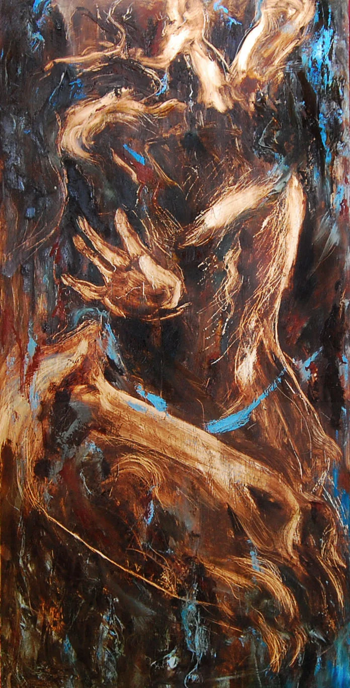 As I look through my body of work, the female figure is depicted somewhat flowy, fluid, semi-open. It's supposed to be showing a feeling of freedom that we experience when we dance. But sometimes I'm not convinced it's open enough or expressing enough. This thought led me to think about re-visiting a small series I did about three years ago. One painting in particular titled Drum Solo (right) that I worked with constructing and de-constructing layers of paint to create the body. I layered on, scrapped and peeled off, and layered on again.