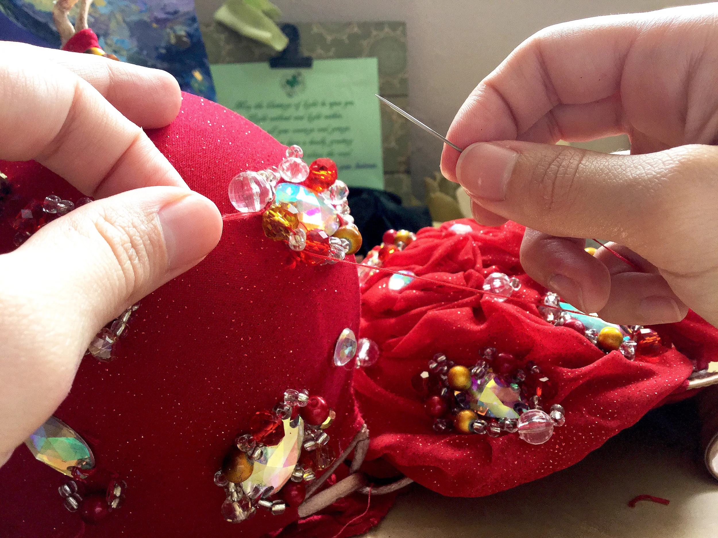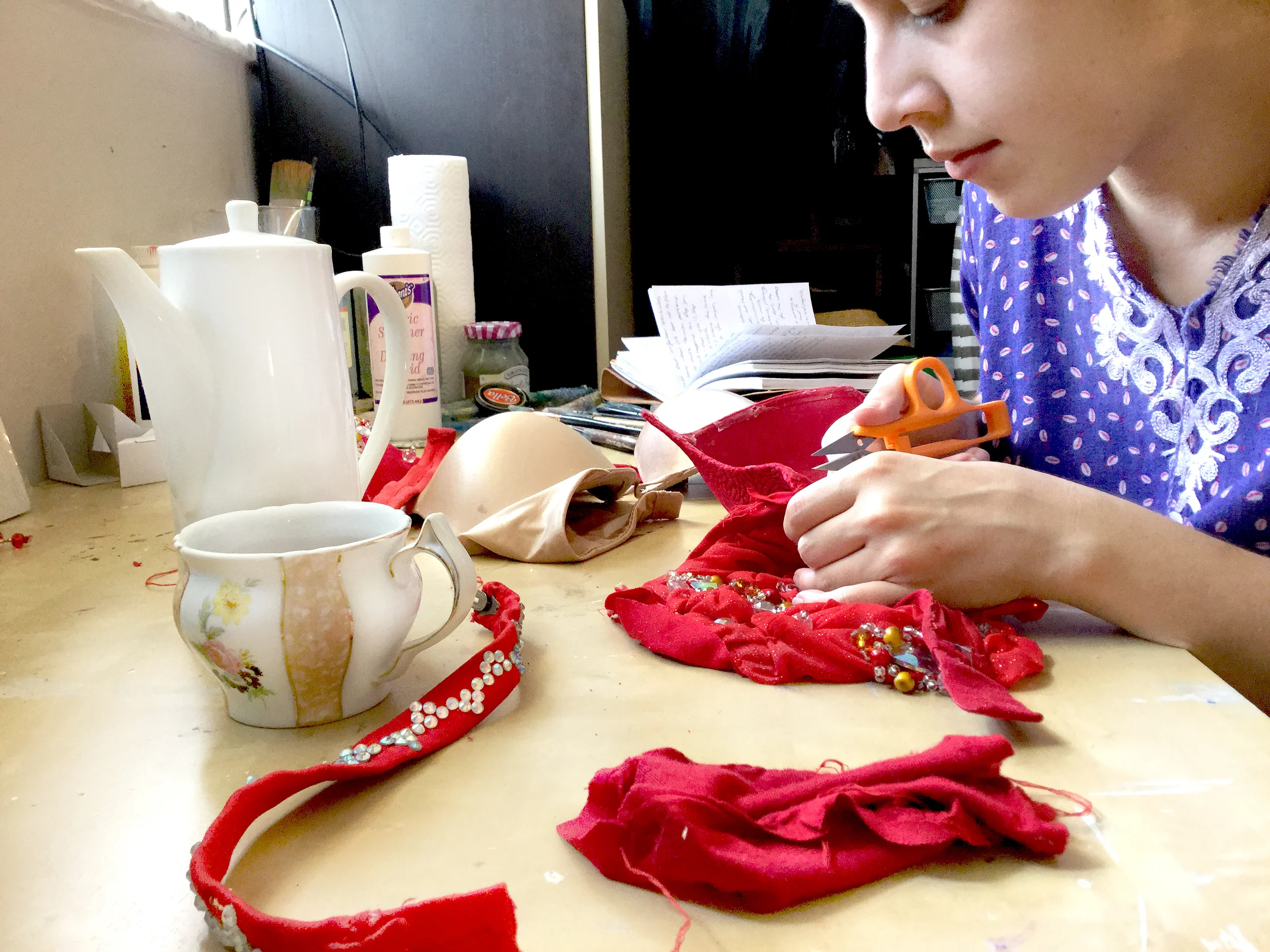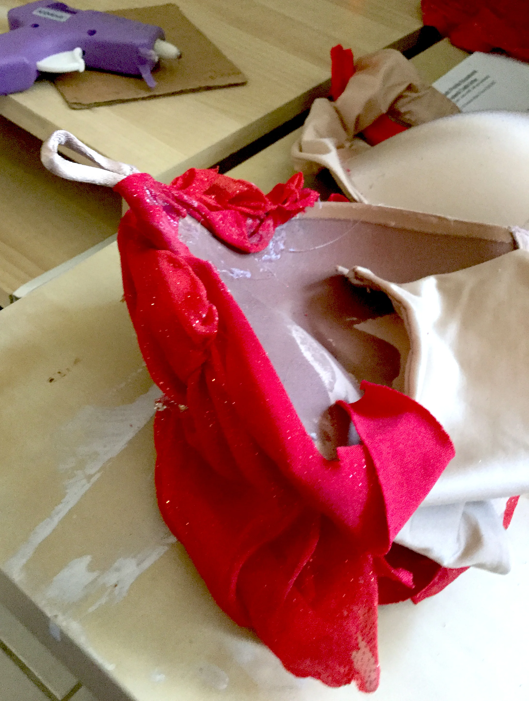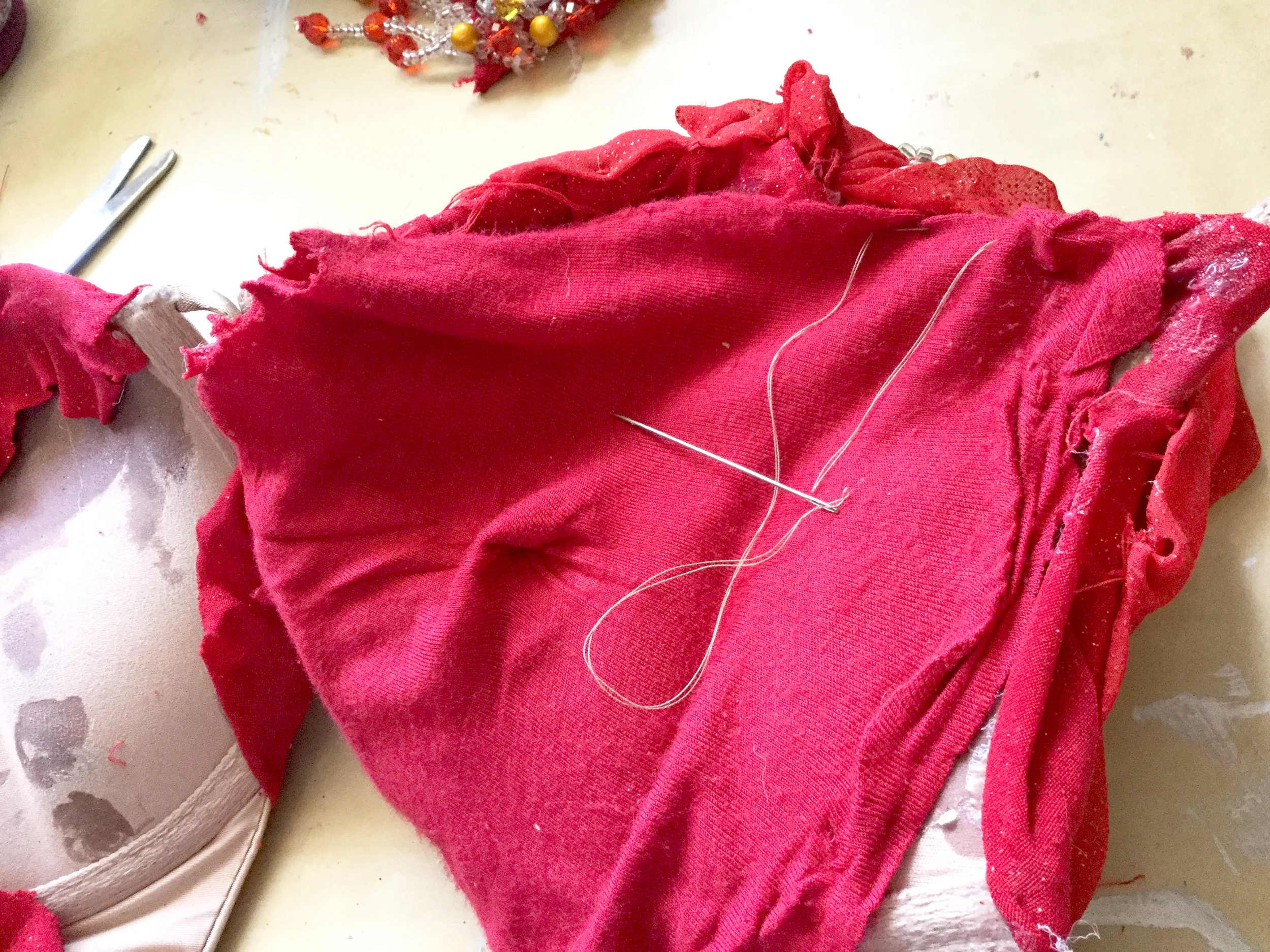 I had all my sewing tools and glue gun to re-construct. I started by covering the outside of the bra and worked my way inwards. The whole process was meditative and thoughtful. After two hours I wasn't nearly finished but felt so appreciative of the workers who make these costumes. I realized all sorts of little personal things as well - like how I've been so stuck on how to work my finances, moving to a new apartment, painting ideas, blog ideas... it was a perfect opportunity, doing these mundane actions of sewing, to welcome all my troubles for tea, say hello... and let them go.