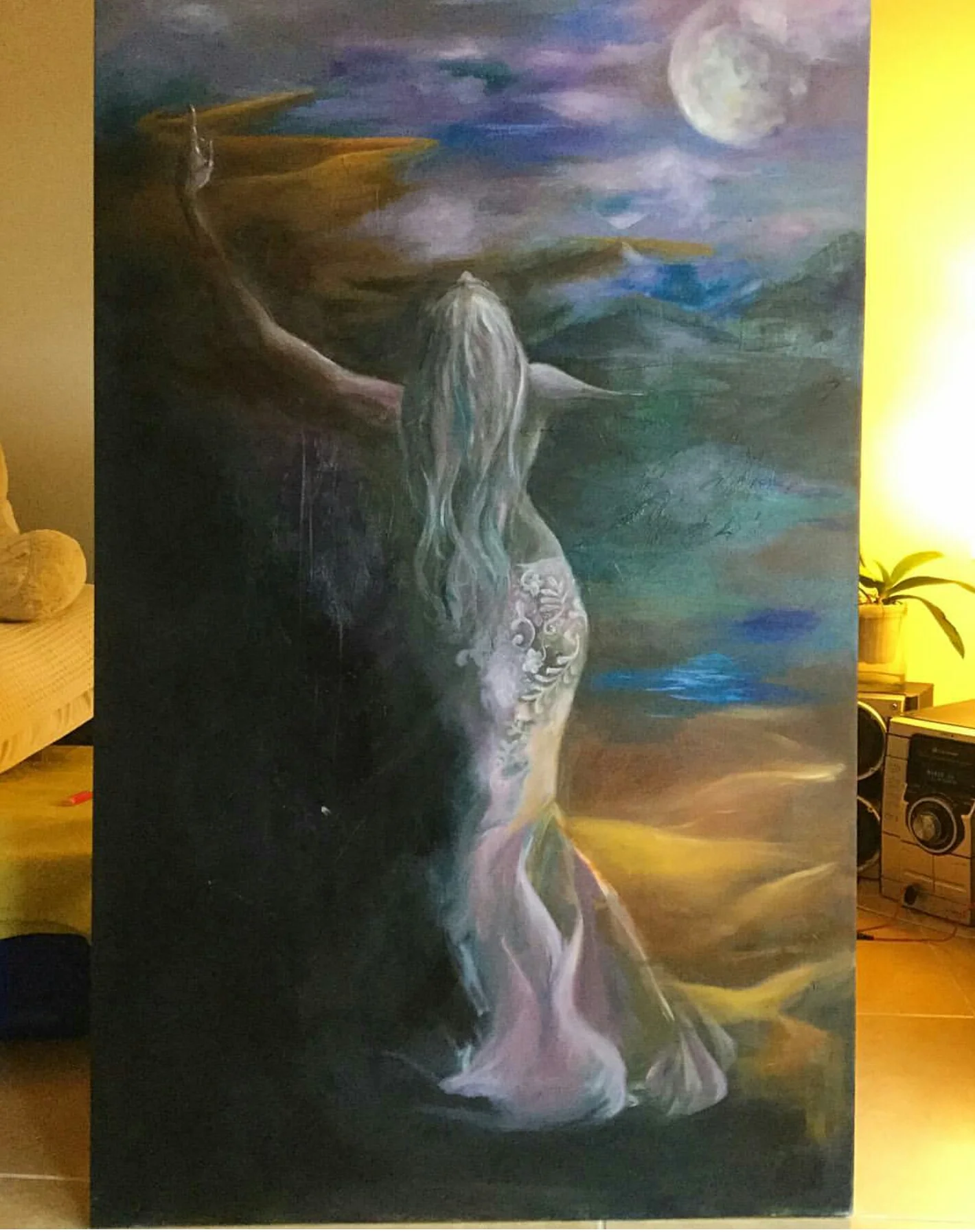 Interpretation: This is the eldest sister. She is facing her back towards us in order to guide us into the painting by her pointing left hand and trailing skirt on the water. I feel her heart is very open because of her extended arms to the sides. She is wild and reserved with her own wisdom. Though we do not see her frontal view, she is bare-breasted as there is no indication of a top, opening her heart towards the land, the moon and beyond to the universe.