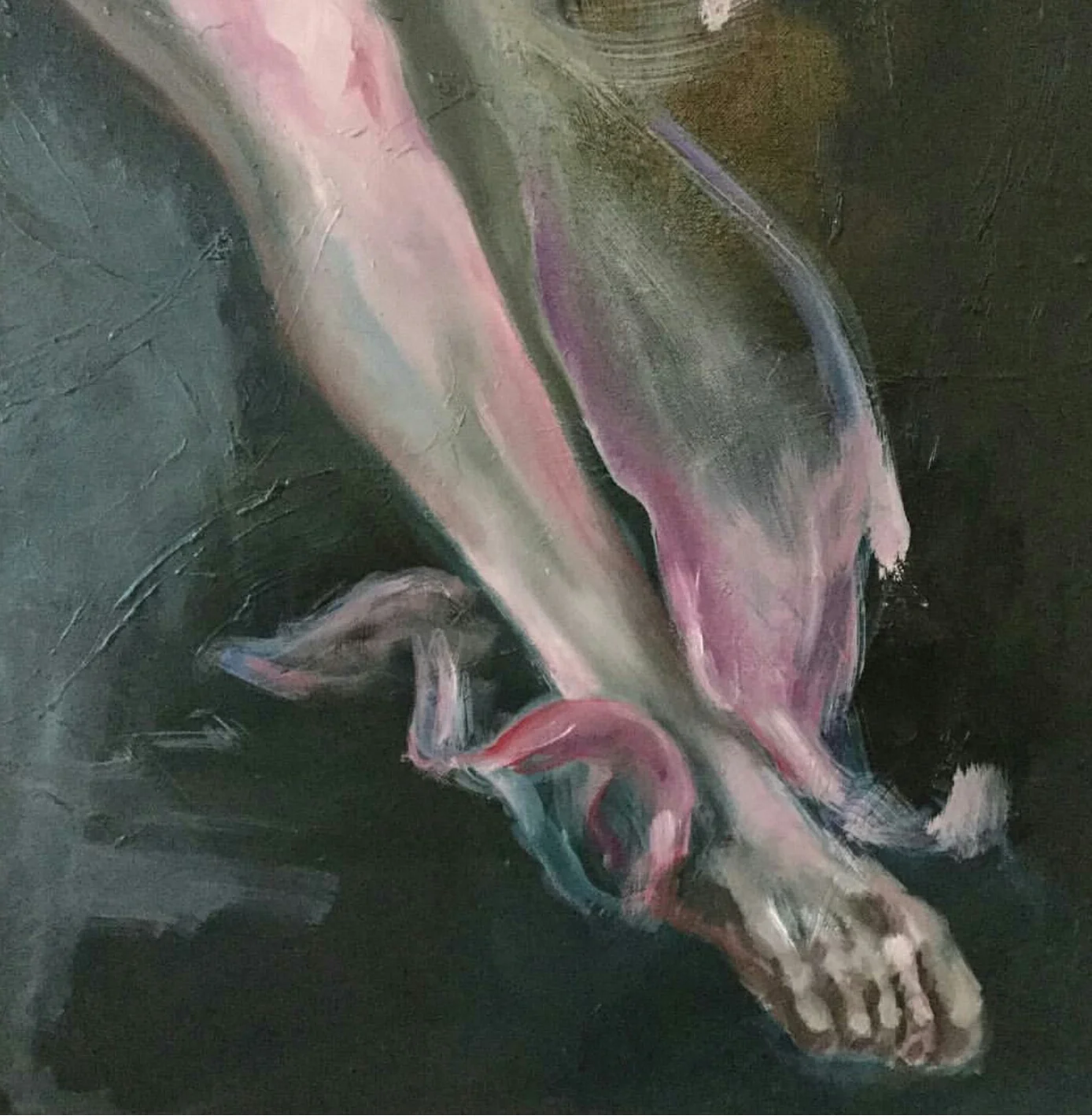 I had been painting her for about a month and a half and felt so stuck that I had to make a second painting, a sister for her so that I could arrange a consistency of style and palette. I had come across a gorgeous photo of a dancer in Argentina that looked just like a Baroque painting. It was mesmerizing!! The soft pink fabrics shined and the lengthening of her pose was just before or after a back bend - I just had to ask to use it as inspiration! Hence came the younger, A Kiss for the Moon. Here, again, I thought I was having a conversation between Russian/Ukrainian dancers versus Argentinian's, which have similar discipline yet differences of culture, music choice and some other elements. My psyche was sending me messages of deeper things I would find out later.