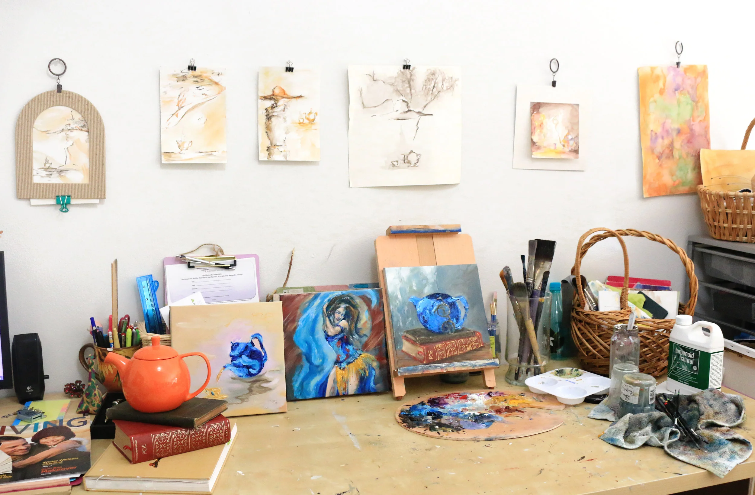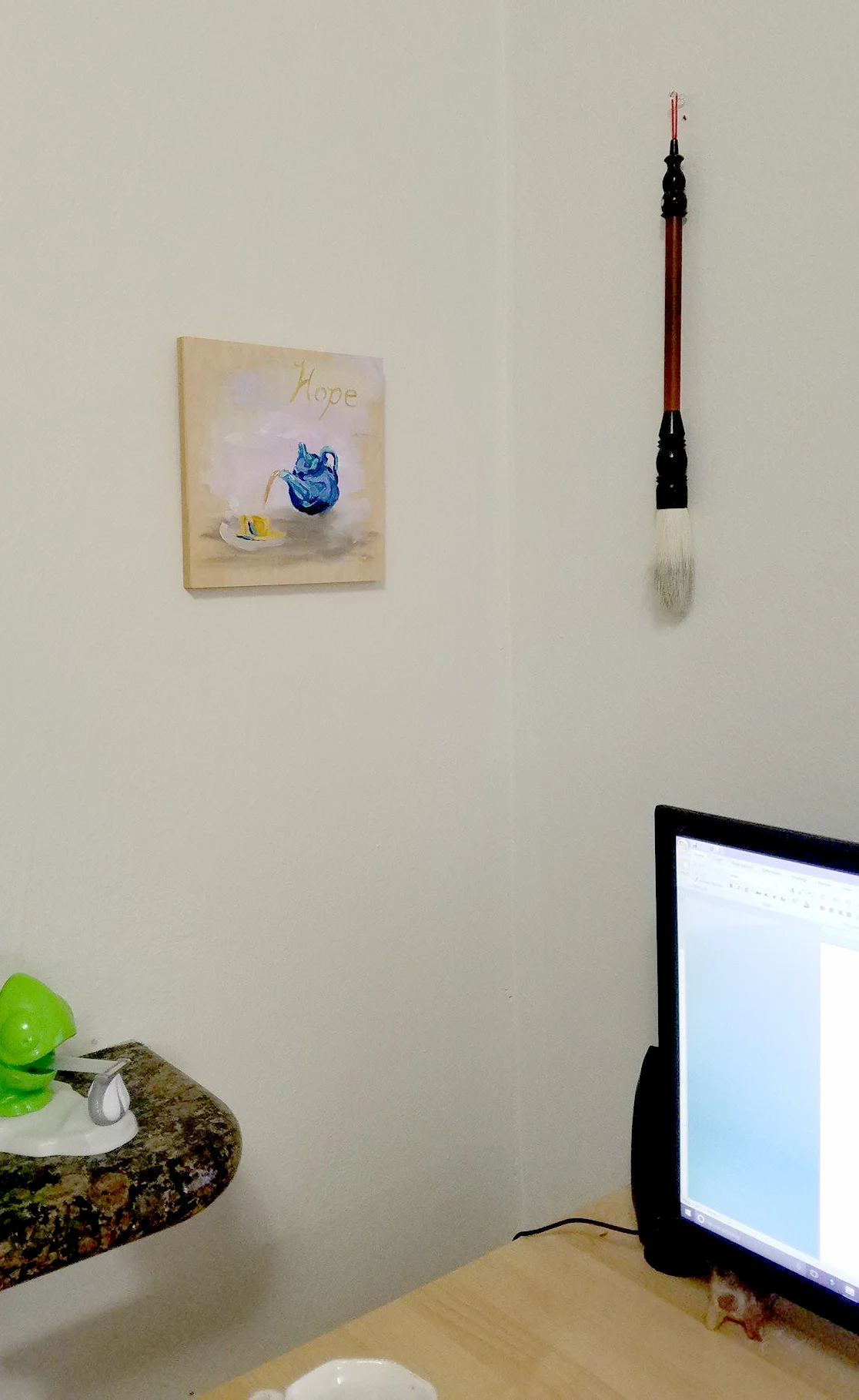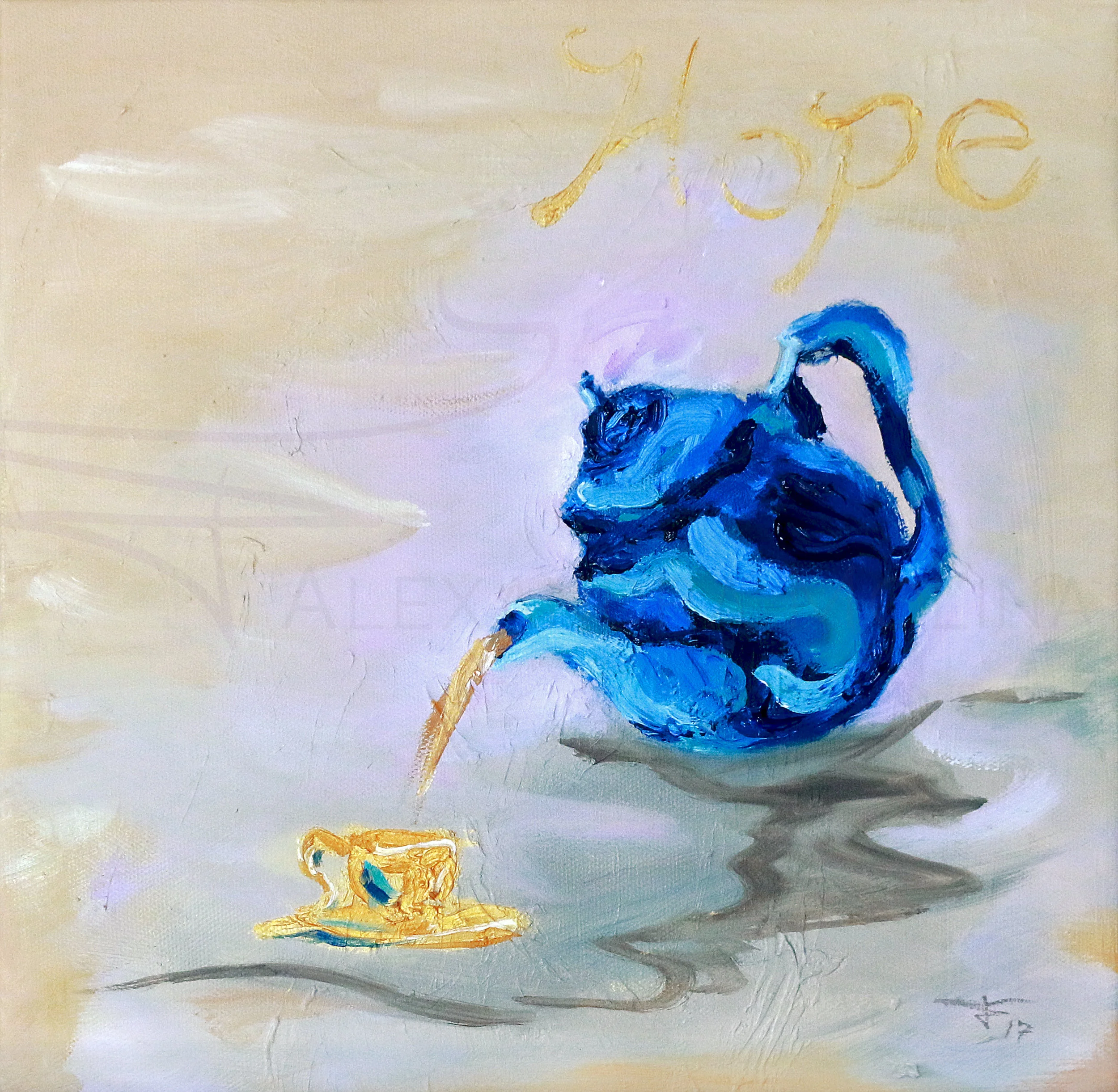 "Hope" is a little painting I made for myself that has helped me through some tough times. I decided to paint a second one to sell and inspire someone who may also need the support. The original hangs over my desk and is my inspiration to keep working hard for the things that I love. Life isn't always magical. It has beautiful and ugly sides - what can we do? It's like the quote from the movie "The Big Short" when they say "Truth is like poetry. And most people fucking hate poetry." Haha! I loved this quote when I first heard it. I believe that in order to succeed we have to acknowledge and work with the good and the bad. My little blue tea pot pouring into the golden cup is my reminder to "stay golden" when I hit some tough places. It's small, intimate and simple.