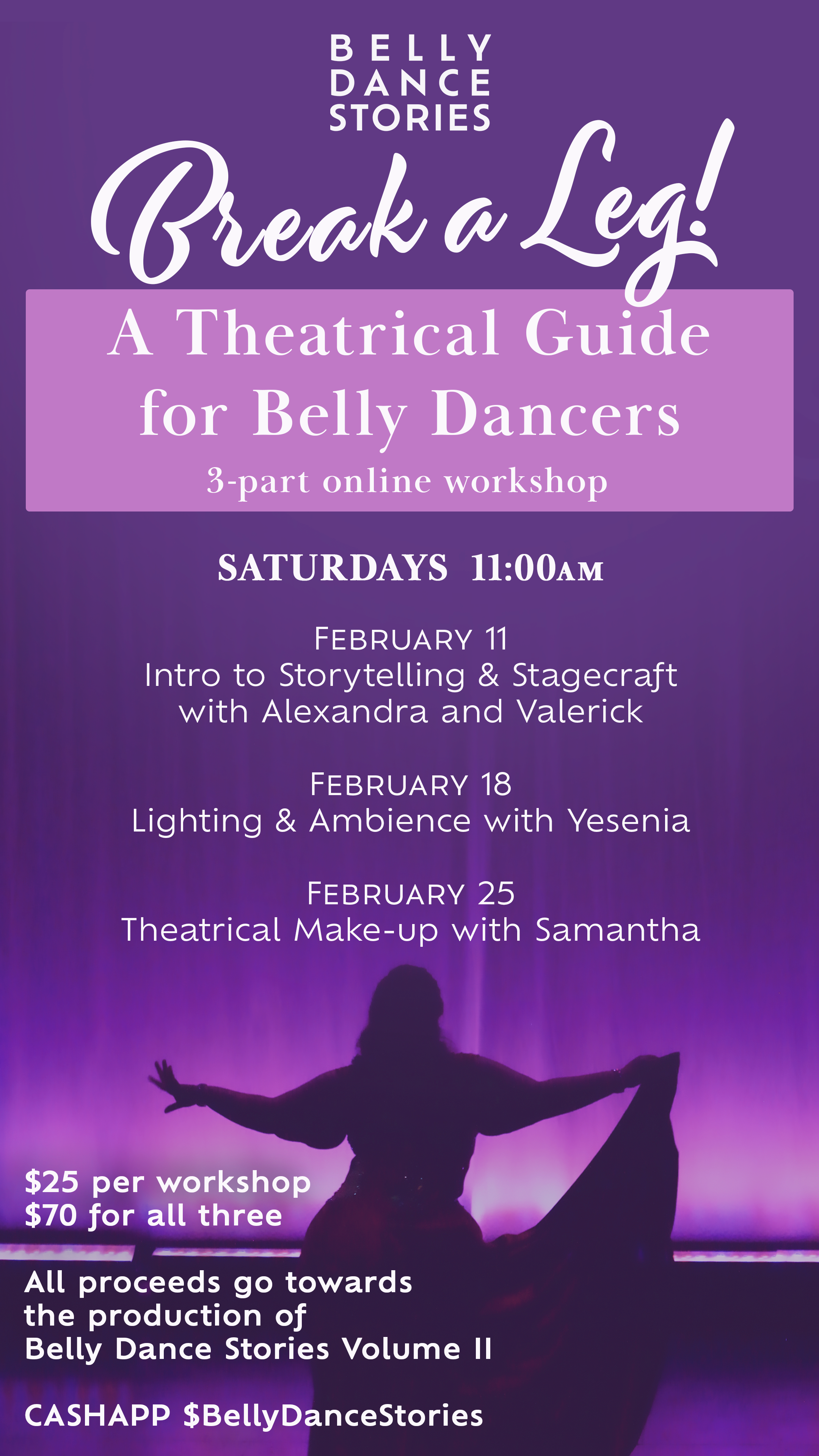 As we get closer to our Belly Dance Stories we have prepared a 3 part workshop that will serve as a guide for your next theatrical presentation. Workshops will happen Saturdays at 11:00am EST through the Zoom platform. All the proceeds will go towards the production of Belly Dance Stories Volume II.